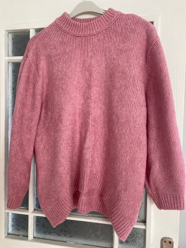 Pembe renkte, triko örgü kadın kazak, yuvarlak yaka ve uzun kolludur. Rahat, normal boy ve bol kesimdir, günlük kullanım için uygundur.
