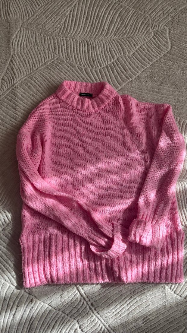 Pembe renkte, yuvarlak yakalı ve uzun kollu, rahat kesimli, normal uzunlukta örme kadın kazak.