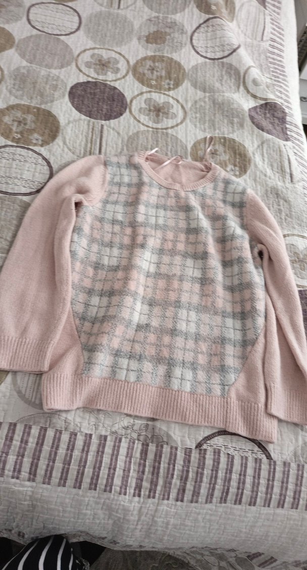 Uzun kollu, yuvarlak yakalı, gevşek kesim pembe triko kadın kazak. Ön kısmında pastel tonlarda ince kareli desen bulunur. Rahat ve günlük kullanıma uygun.