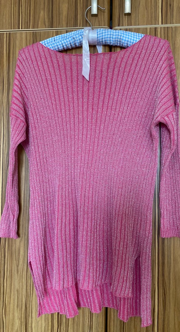 Pembe renkli, kayık yakalı ve uzun kollu triko kadın kazak. Gevşek kesim ve parlak dokusu günlük rahat kullanıma uygundur. Normal boyda ve desensiz, konforlu normcore tarzda.