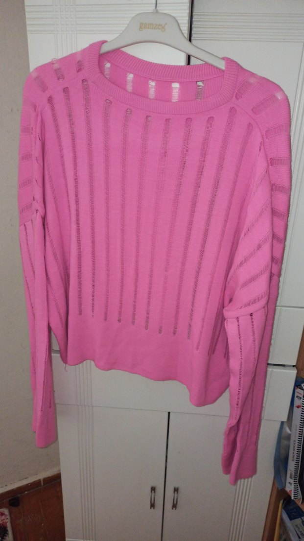 Pembe renkli, triko dokuma kadın kazak uzun kollu, yuvarlak yaka ve bol kesimdir,eteğide beli lastikli bol paça ucunda yırtmacı vardır kalın kumaşlıdır Pastel şeker pembesi tonlarda ve desensiz, günlük kullanıma uygundur esnektir.etek boyu 100 cm, triko 50 cm, 38_40 bedene olur sanırım ki