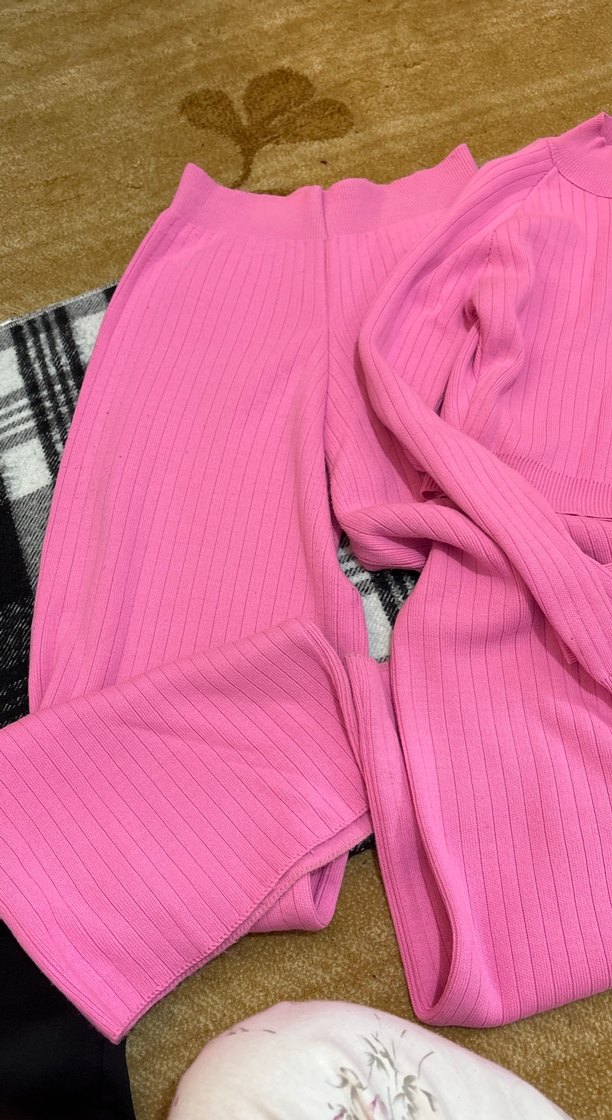 Pembe, uzun boy, triko dokulu, yumuşak sentetik kumaştan yapılmış, rahat ve şık kadın kumaş takım artık giymediğim için satıyorum