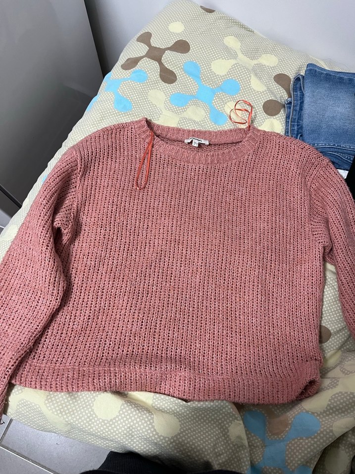 Pembe triko kumaştan, salaş kesim, uzun kollu ve yuvarlak yaka kadın kazak. Günlük kullanıma uygun rahat bir model.