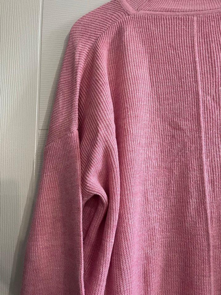 Pembe triko, kayık yaka ve uzun kollu. Yumuşak keten kumaştan, rahat ve bol kesim, desensiz tasarım, günlük kullanım için uygun.