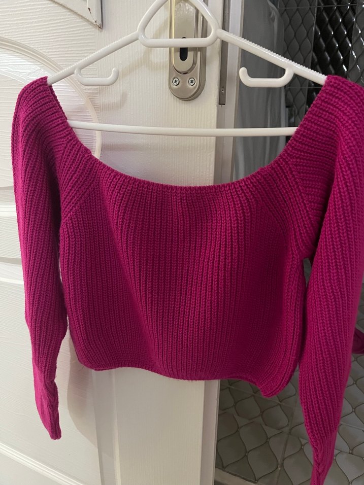 Fitted kesim, uzun kollu, triko kumaştan pembe kadın bluz. Crop kısa boy ve kayık yaka detayıyla günlük, rahat sokak stili sunar.