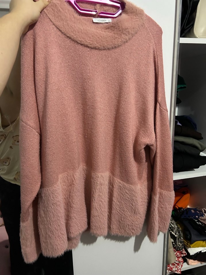 1 kere giyildi Pembe renkli, triko dokuma uzun kollu, yuvarlak yakalı, bol kesim ve normal midi boyda rahat bir kadın kazağıdır. Yumuşak kumaşıyla konfor sağlar.