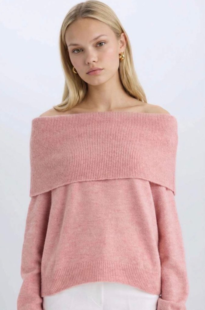 Pembe Triko Kayık Madonna Yaka Kadın Kazak