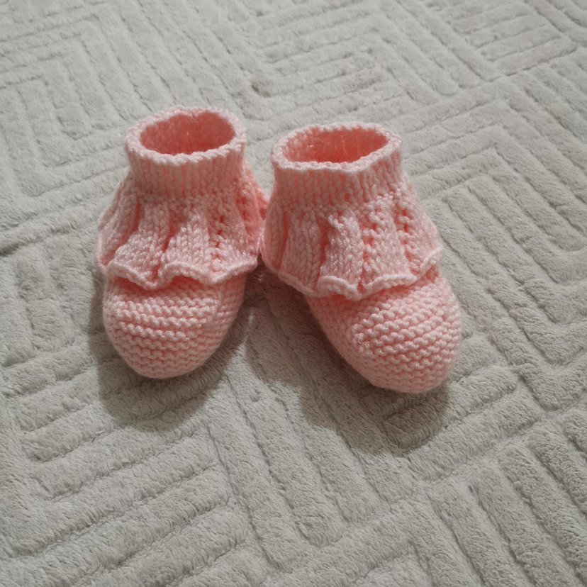 Yumuşak dokulu, pembe renkli, fırfırlı kenarlı kız bebek triko patik. Küçük ayakları sıcak tutar.
