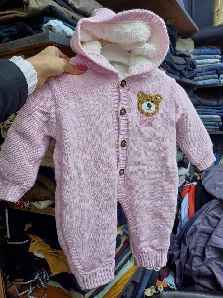 Triko dokulu, nakışlı ayıcık detaylı, pembe pastel renkli kız bebek tulumu, içi yumuşak ve sıcak kumaşla kaplıdır. ❄️ 3 aylık Boy 50 cm en 35 cm