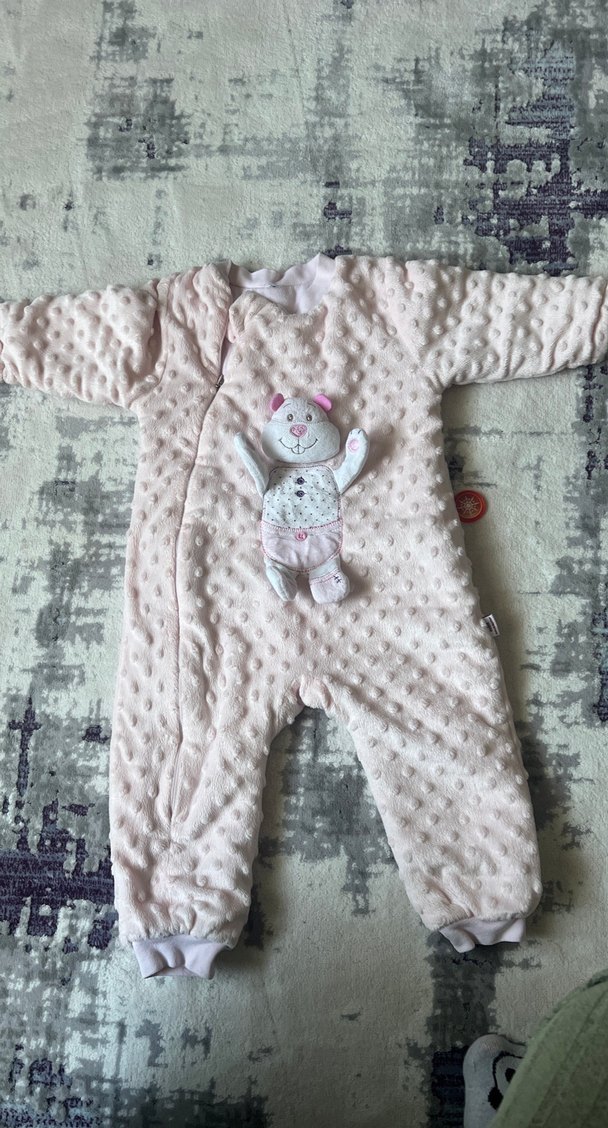 Pastel pembe renkte, triko dokulu, bisiklet yaka kız bebek tulumu. Önünde sevimli ayıcık aplikesi bulunur.