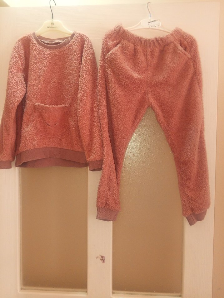 Pastel pembe triko kız çocuk eşofman takımı, uzun kollu ve bisiklet yaka. Yumuşak ve sıcak kumaştan, rahat kesimli, ön cepli üst ve manşetli alt pantolon içerir. sol diz kısmında hafif incelme var yırtık yoktur üstün de ayıcığı kayboldu yumuşacık panduflar hiç kullanılmadı fiyatı uygun kaçırmayın panduflar 27.28numara 4.5yaş uyumlu takım