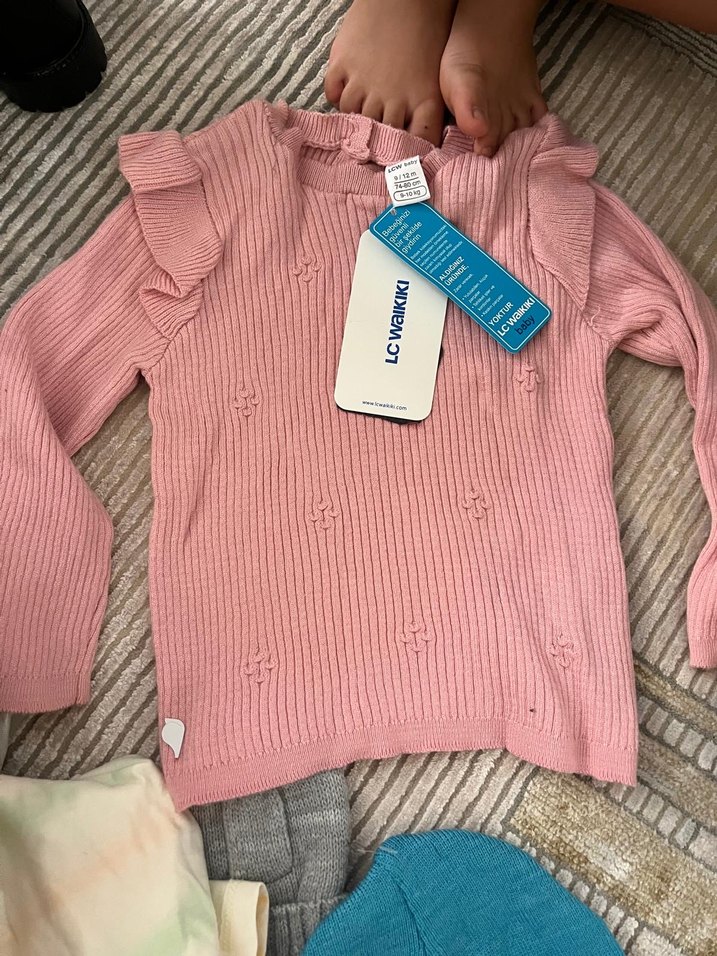 Pembe renkli, uzun kollu ve yuvarlak yakalı, kız çocuklar için ince triko kazak, yumuşak kumaş ve hafif desen detaylarına sahiptir.
