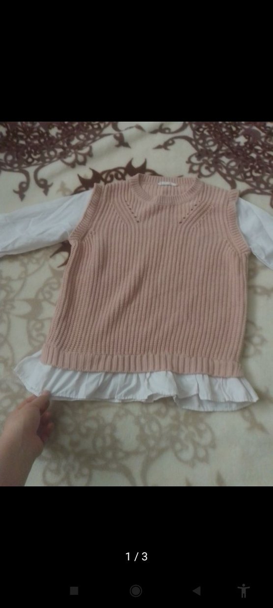 Pembe pastel renkte, kolsuz ve rahat kesim triko süveter. Orta uzunlukta, yuvarlak yaka ve desen içermeyen günlük kullanıma uygun parça.
