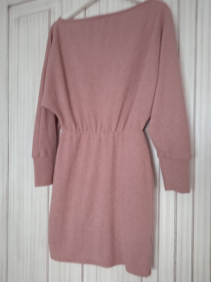Pembe pastel renkte, rahat kesim, kayık yaka kadın kazak. Uzun kollu ve midi boyda, yumuşak triko kumaştan örülmüştür.