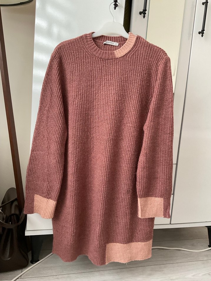 Pembe pastel tonlarda, yumuşak triko kumaştan, uzun kollu ve bol kesim midi uzunluğunda kadın kazak. Bisiklet yaka ve desensiz yapıda.