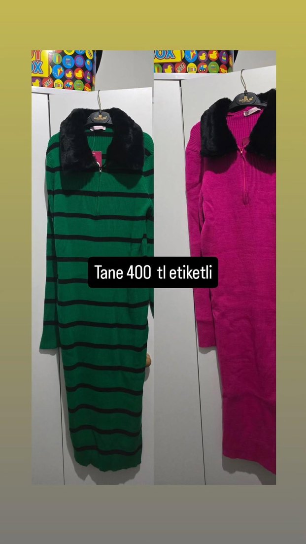 Pembe, uzun kollu, boğazlı ve triko kumaştan yapılmış, vücuda oturan rahat bir elbisedir 400 TL etiketlidir.