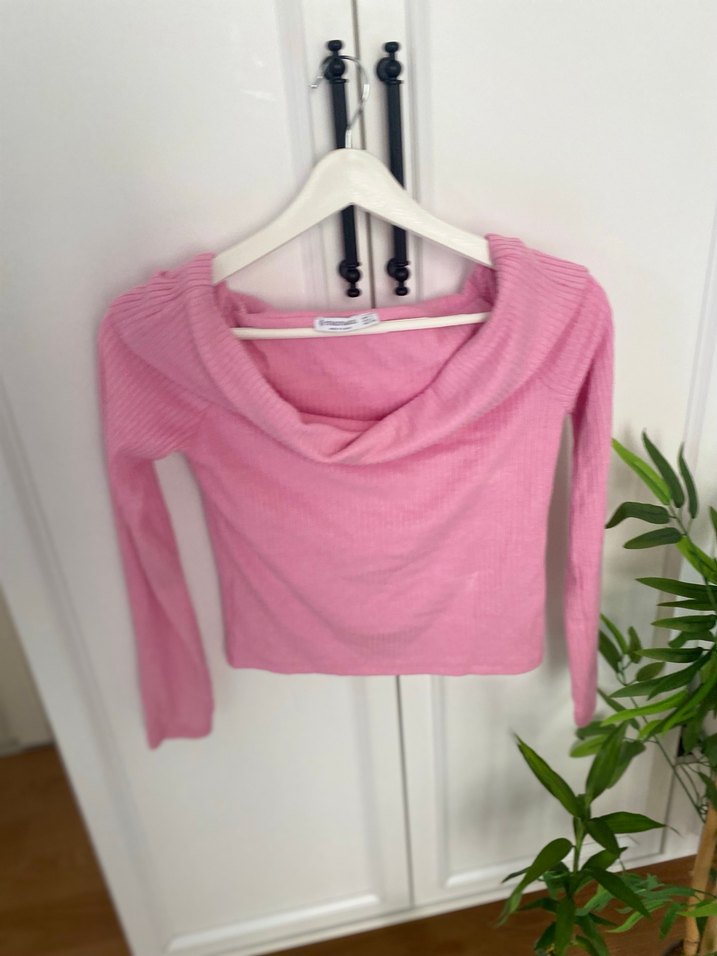 Pembe triko, uzun kollu, kayık yaka ve kısa kesime sahip. Yumuşak keten kumaştan, pastel tonda, trend sokak stiline uygun.