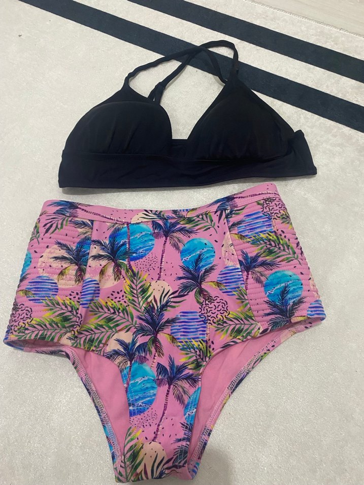 Canlı pembe tropikal tie-dye desenli yüksek bel bikini altı, siyah askılı bikini üstü ile uyumlu, sıkı kesim plaj kombini.