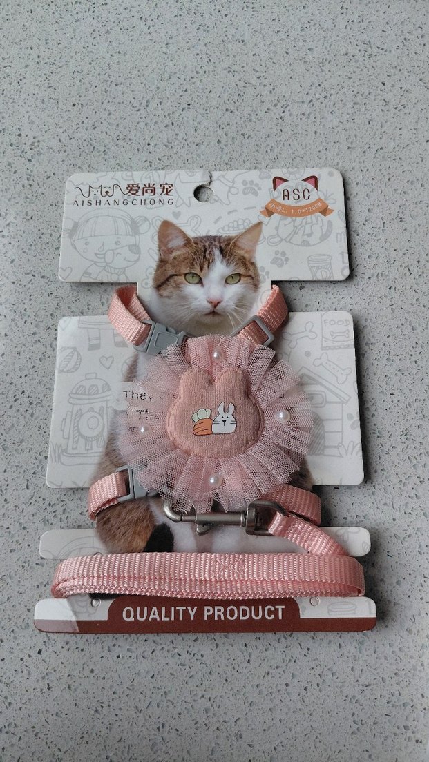 Pastel pembe renkte, tavşan ve havuç desenli tül çiçekli, ayarlanabilir kayışlı kedi göğüs tasması.
