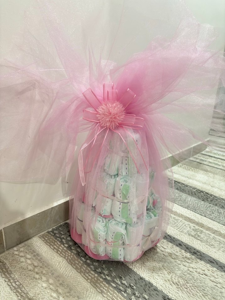 Pembe tül ile sarılmış, çiçek detaylı bebek bezi sepeti, hediye için uygun. Bezleri aldım isterseniz Onuda verebilirim jenny wili bebek bezi 4 numara ama bebek beksiz fiyatı