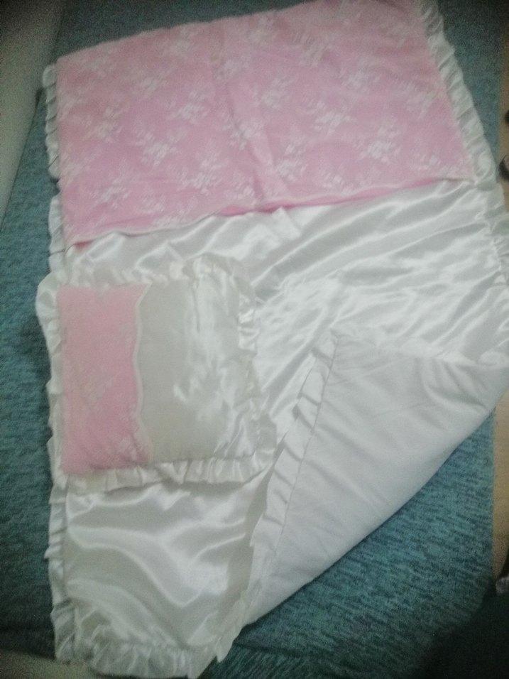 Pastel pembe üzerine tül dikilmiş saten üzerine yorgan iç kısmi pamuklu uyumlu yastıktan oluşan ve 4 adet kpruması ayni şekilde diklmiştir, parlak ve yumuşak sentetik kumaştan yapılmış çocuk uyku seti.