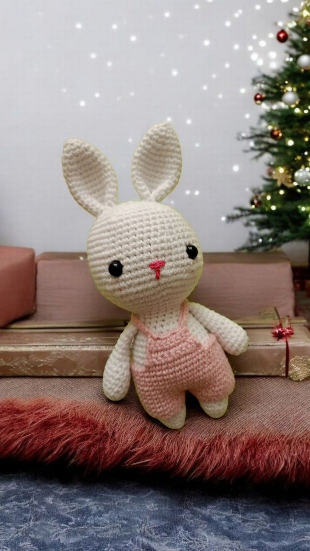 Yumuşak dokulu, büyük kulaklı ve siyah gözlü, pembe tulum giymiş pastel peluş tavşan oyuncak.