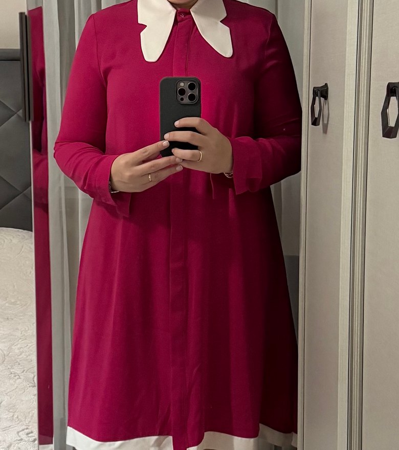 Pembe tonlarda, bol kesim ve uzun kollu kadın tunik, beyaz kelebek desenli yakasıyla sade ve desen içermeyen Paris tarzı normcore modeldir. Sadece 1 kez giyildi. 42 beden omuzdan boyu 100 cm