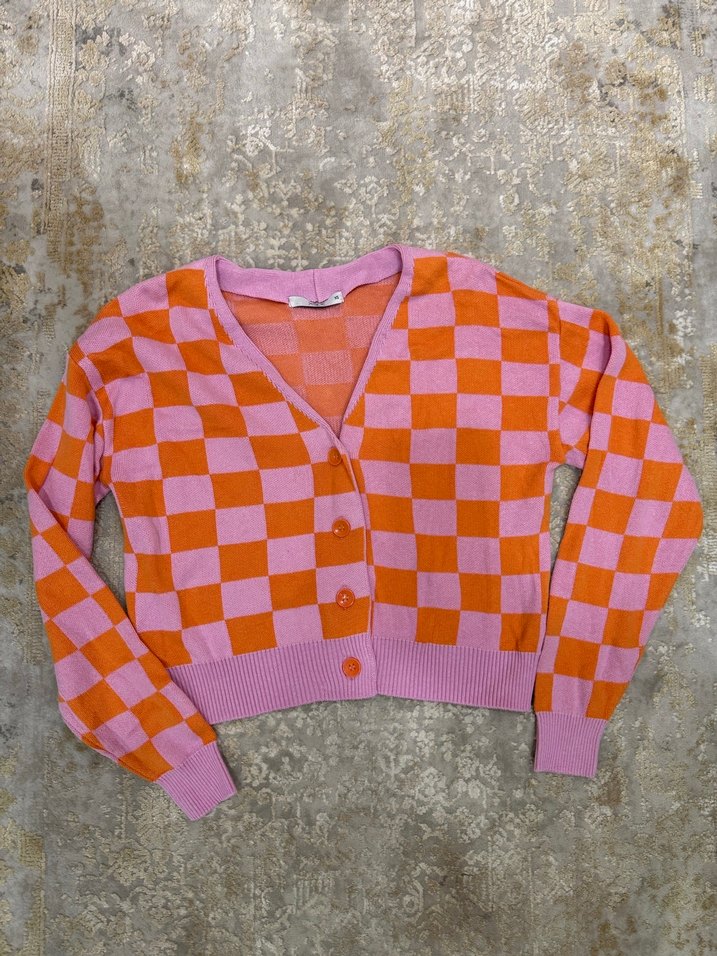Pembe ve turuncu kareli örgü kumaştan, uzun kollu, bol kesim ve normal midi boyda kadın hırkası. Günlük kullanıma uygun, düğmeli ve kayık yaka detaylı.