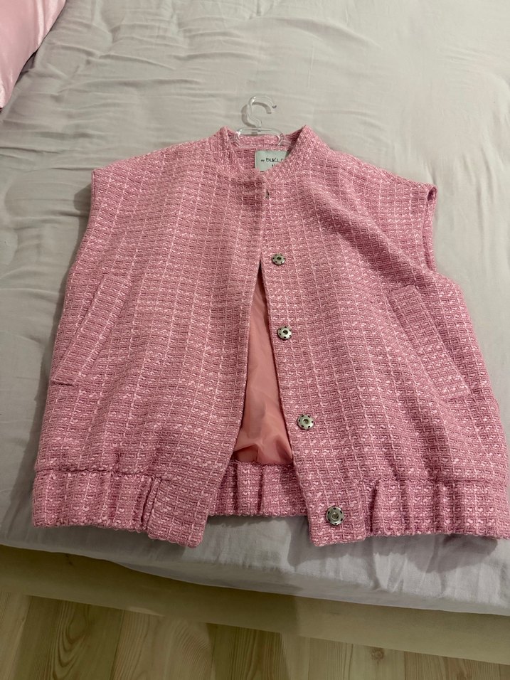 Düğmeli, yakalı ve kolsuz pembe yelek, sentetik kumaştan yapılmış, rahat kesimle trend sokak stiline uygun.