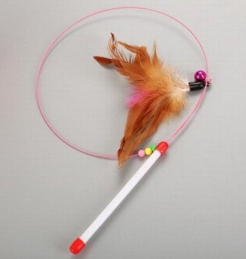 Renkli tüyler ve zilli, pembe saplı boncuklu kedi oyuncağıdır.