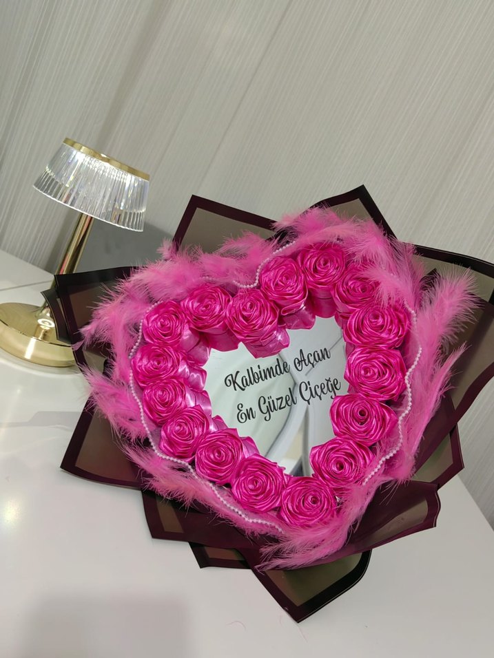 Pembe, parlak tüylü detaylı kalp şeklinde kız aksesuarı, baskılı güllerle süslenmiştir. Üzerinde "Kalbimde Olcan" yazısı bulunmaktadır.