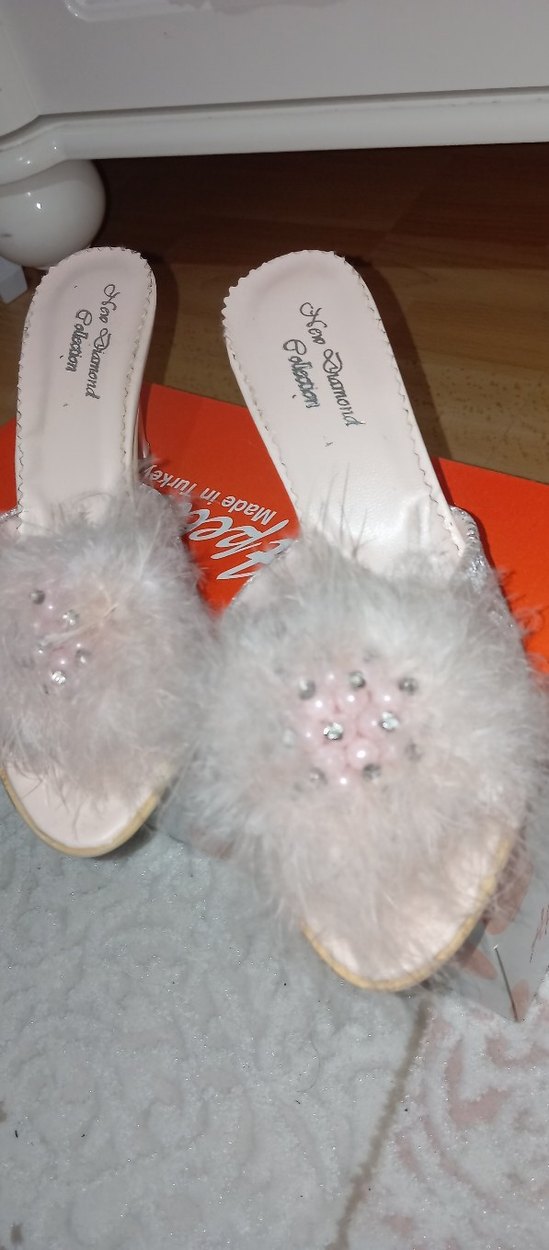 Sentetik kumaştan yapılmış, tüylü detaylı ve işlemeli pembe dolgu topuklu kadın terliği. Bohem tarzda, gösterişli gelin terliği. sıfır hiç giyilmedi 37 numara