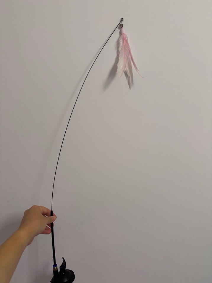 Esnek saplı, pembe pastel tüylü kedi oltası oyuncağıdır. Vakumlu bir yere sabitleyebilirsiniz
