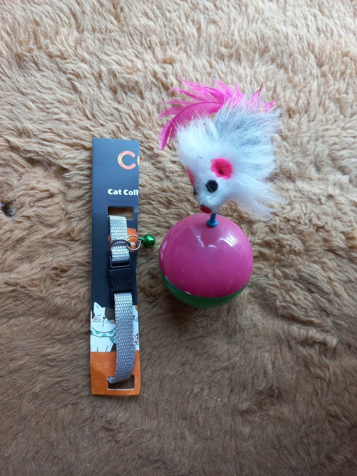 Pembe Tüylü Kedi Oyuncağı ve Gri Kedi Tasması