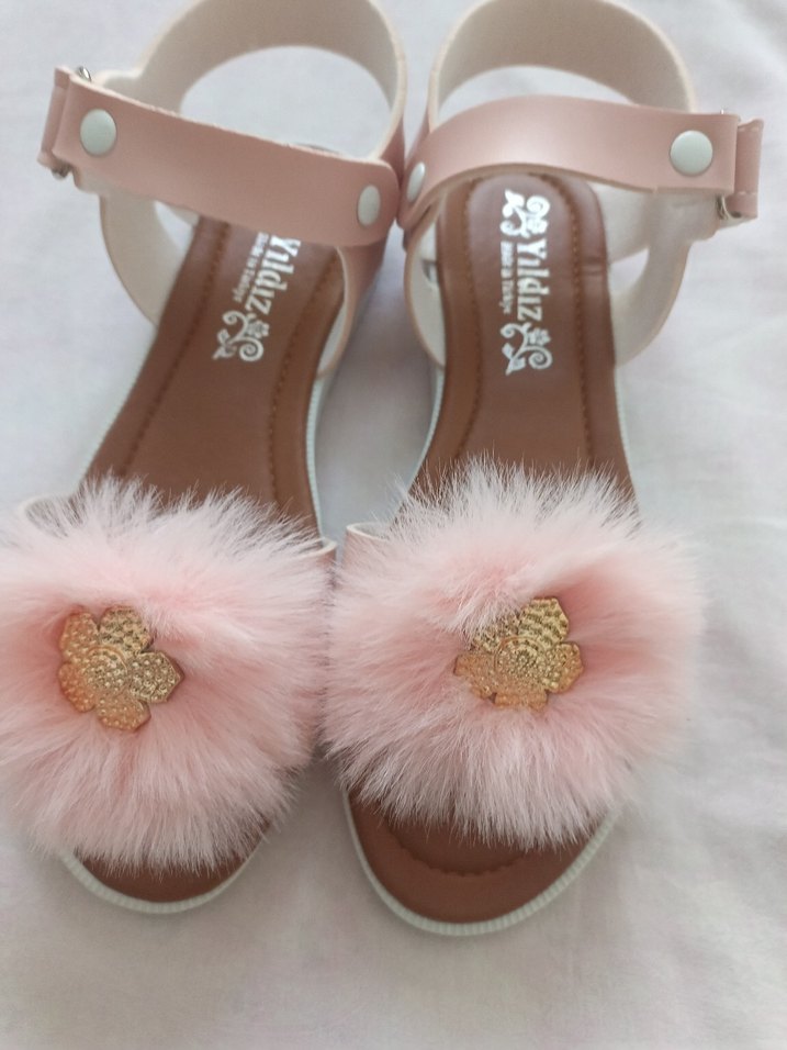Yumuşak tüylü detaylara ve altın renkli çiçek baskısına sahip pembe kız çocuk sandaletleri. Rahat sokak stili için kauçuk tabanlıdır.