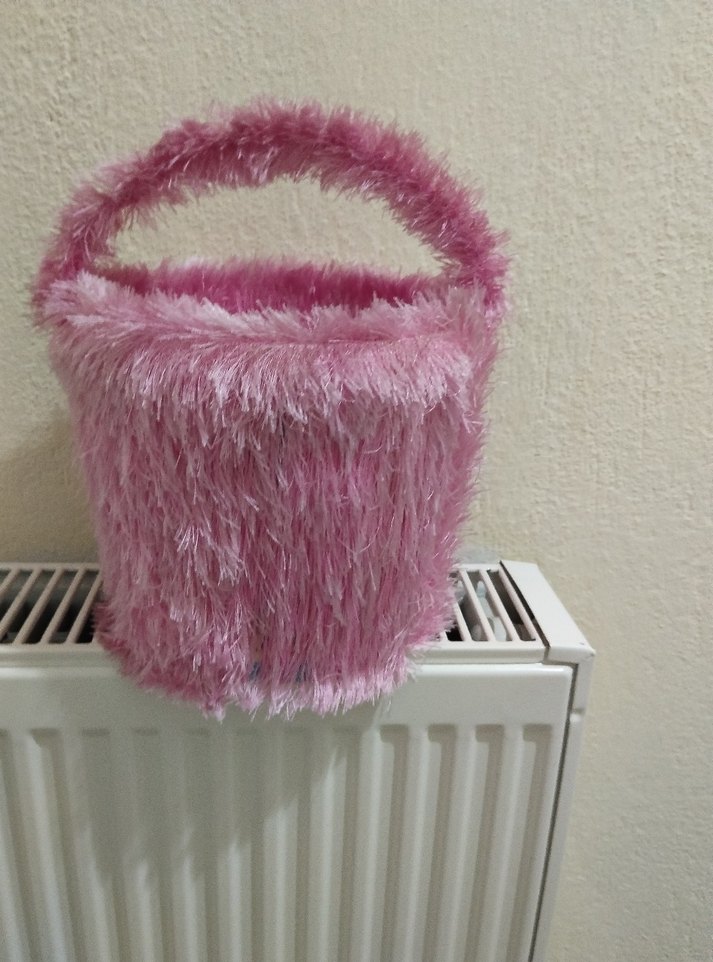 Yumuşak sentetik kumaştan yapılan bu pembe tüylü kova. 3 kiloluk yopurt kovasına örgü örüldü