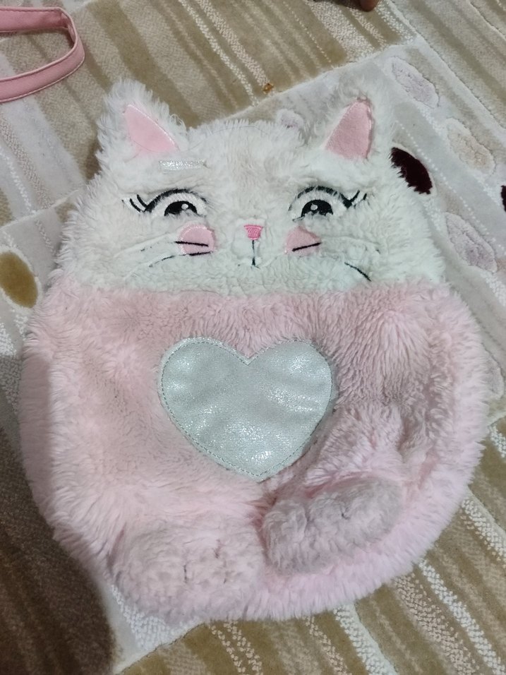 Tüylü detaylı, nakışlı yüzü ve parlak kalp desenli pastel pembe kedi çanta Yumuşak ve rahat tasarım.