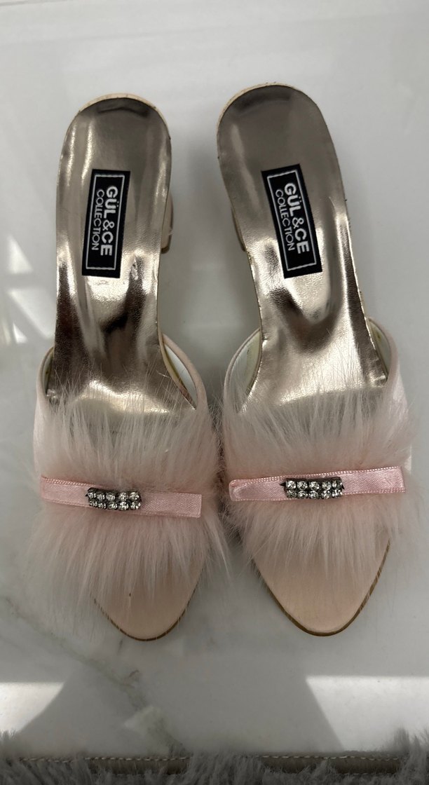 Pembe yüksek topuklu terlikler, yumuşak tüylü detaylar ve taşlı fiyonk süslemeye sahiptir. Kauçuk tabanlı, klasik ve zarif stil için uygundur.