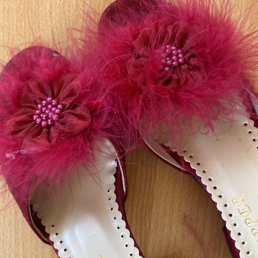 Sentetik kumaştan yapılmış, tüylü detaylı ve nakışlı pembe yüksek topuklu kadın terlikleri. Bohem ve gösterişli tarzlar için uygun.