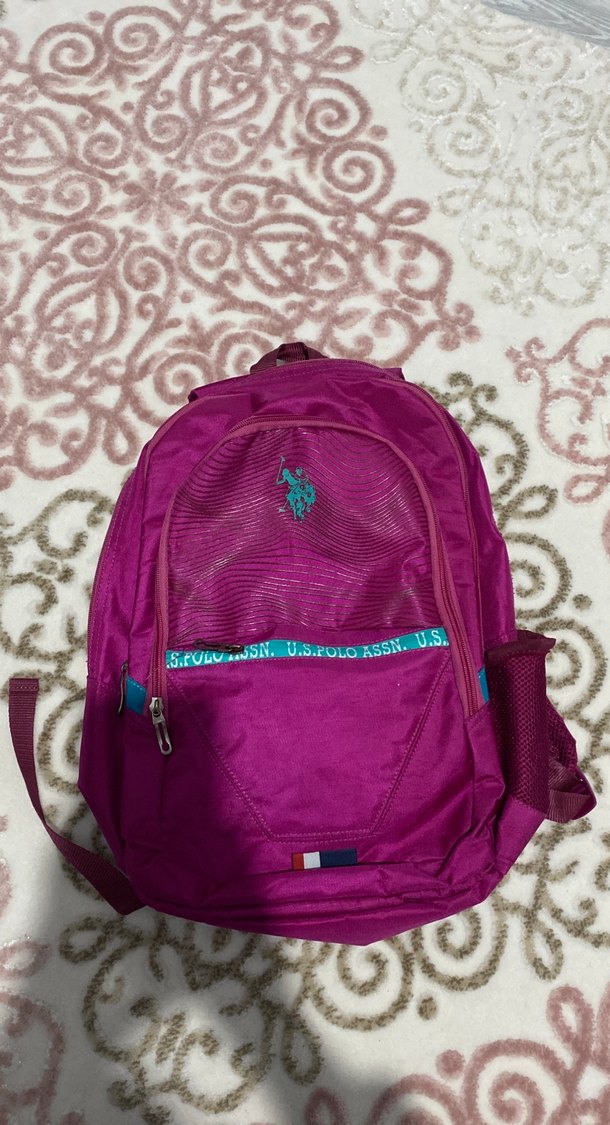 Mor renkli çocuk okul çantası, çok bölmeli ve yan cepli. Renkli detaylar ve ön logo bulunur.