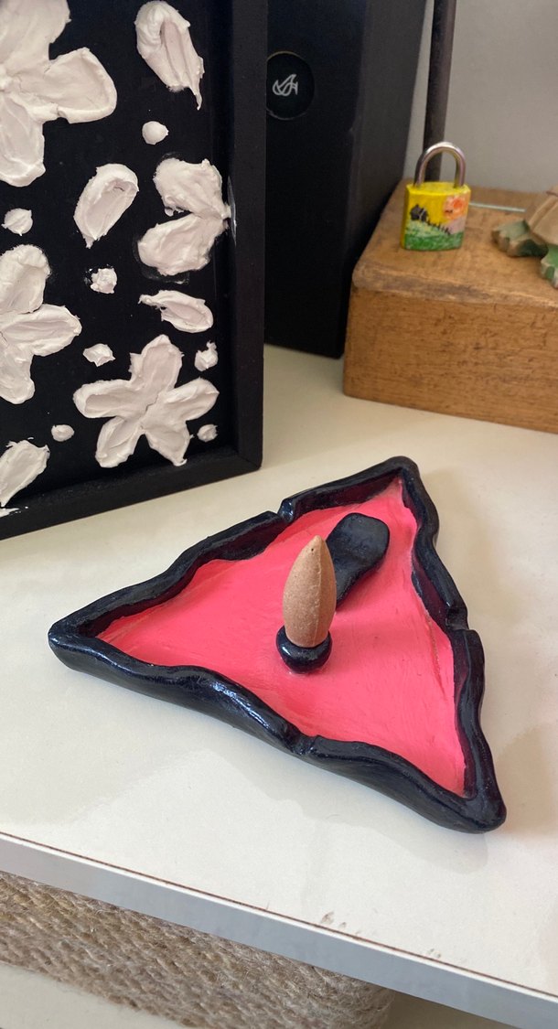 Pembe üçgen şekilli, dikkat temalı estetik tütsülük-küllük-takı standı.