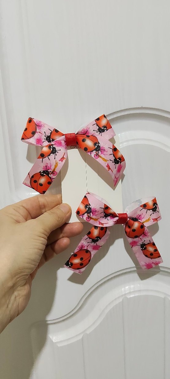 Pembe renkli, uğur böceği desenli ve fiyonk detaylı saç tokaları, bohem ve şık tarz için uygun.