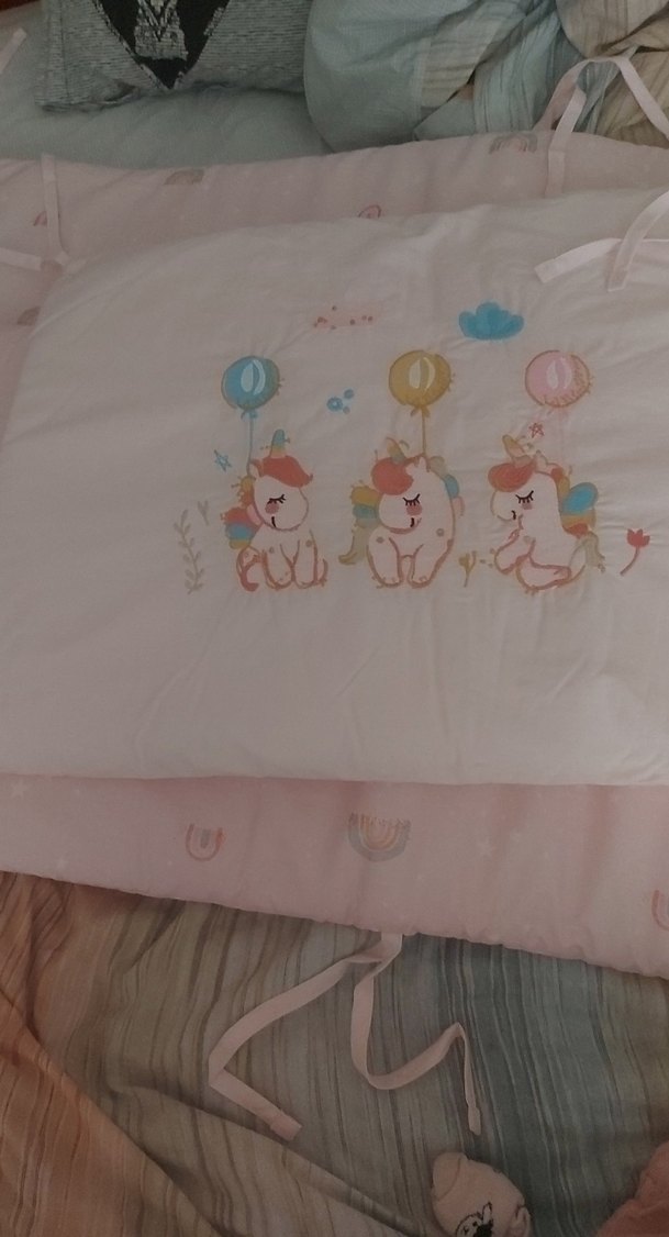 Yumuşak sentetik kumaştan yapılmış, pembe renkli ve pastel unicorn baskılı çocuk uyku aksesuarıdır. Bağlama ipleri mevcuttur.
