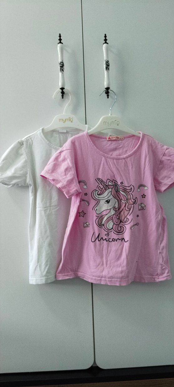 Pamuklu, pembe renkli, bol kesim kız tişörtü. Kısa kollu, yuvarlak yaka, unicorn baskılı, rahat sokak stili. Marka: mymio.
