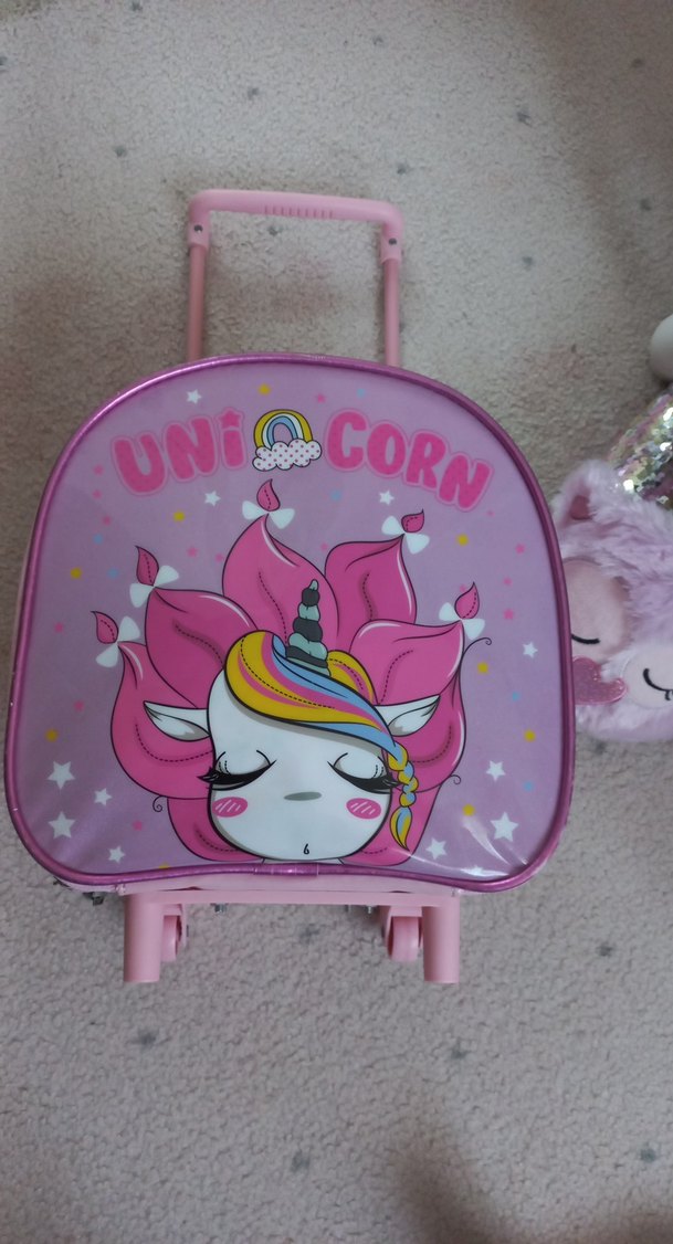 YEPYENI , Pastel pembe renkli, unicorn ve gökkuşağı desenli çocuk okul çantasıdır. Tekerlekli ve saplıdır, kolay taşınır.