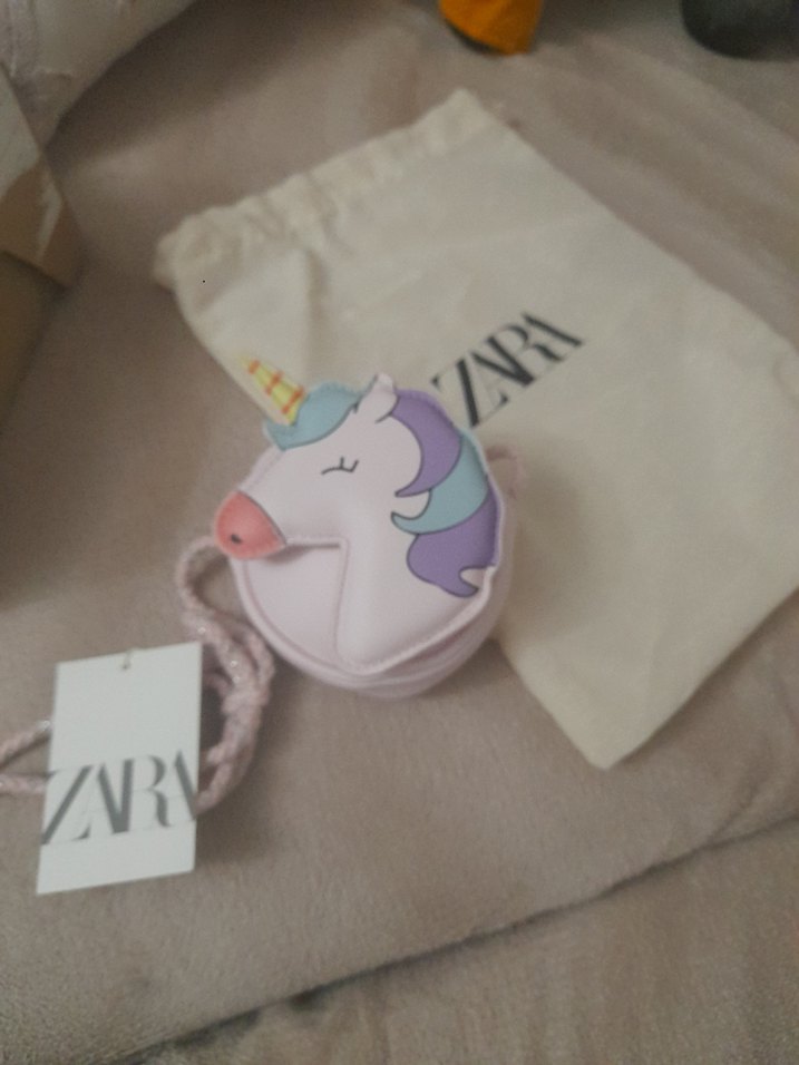Pastel pembemsi tonlarda, unicorn desenli yumuşak dokulu bebek çantası, yanında ipli koruma torbası. Marka: ZARA