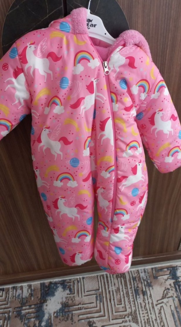 Renkli pembe, unicorn ve gökkuşağı desenli bebek tulumu, yakasında kesik yaka ve kürk detayları bulunur. Soğuk havalar için sıcak ve konforlu. hic giyilmedi