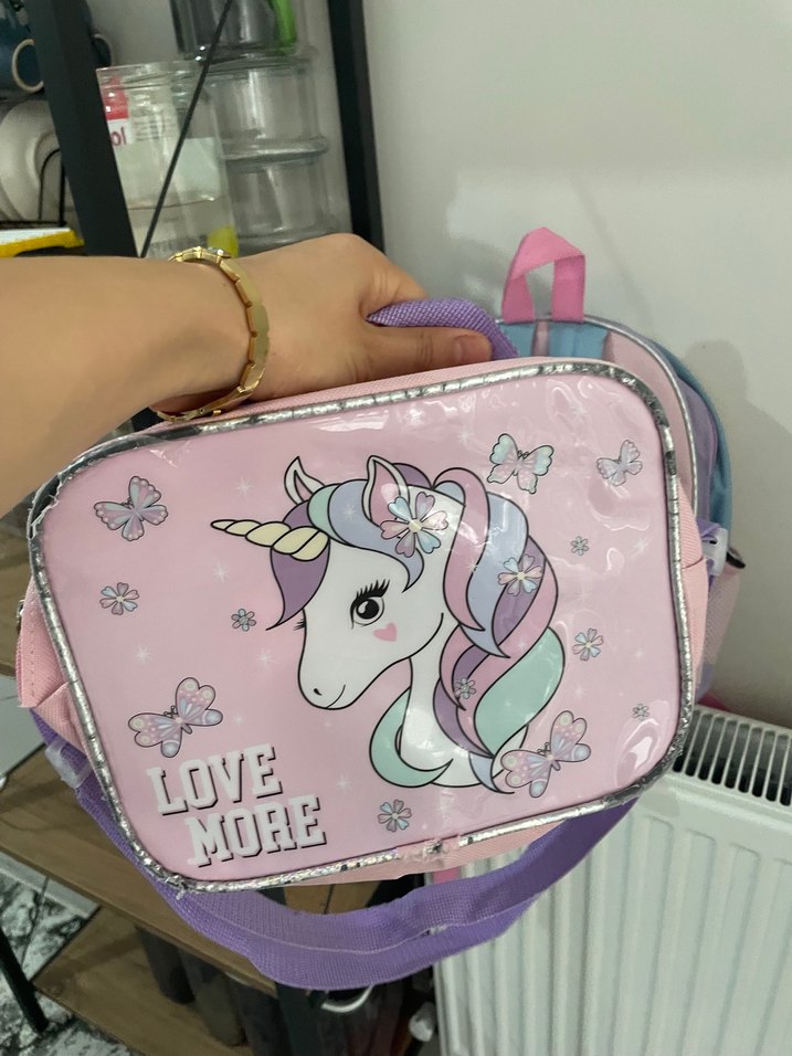 Pembe tonlarında unicorn ve kelebek desenli çocuk okul çantasıdır. Önünde "LOVE MORE" yazısı bulunur. Mor ayarlanabilir askısı ve taşıma sapı vardır.