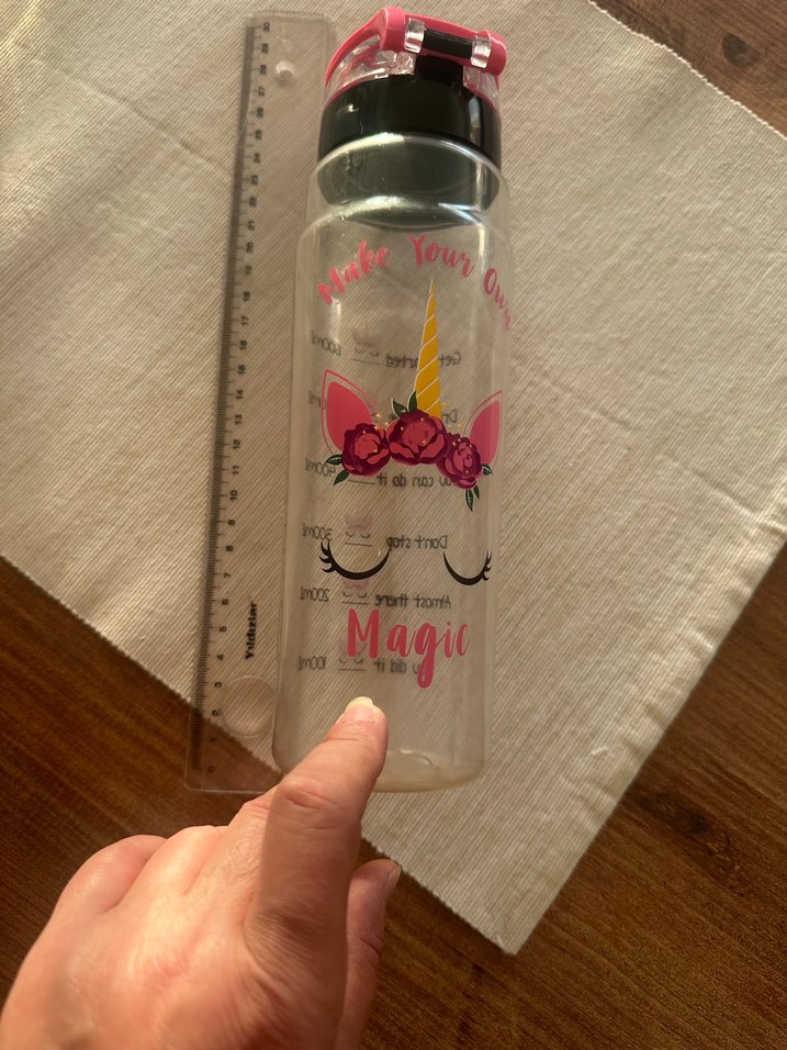 Pembe renkli, unicorn desenli çocuk matarası. Kapaklı ve kolay açılır yapıda, üzerinde "Magic" yazısı bulunur.