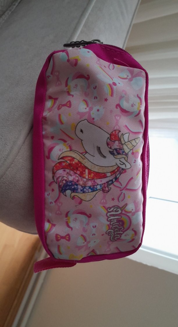 Pastel pembe renkte, renkli unicorn desenli ve fermuarlı çocuk okul çantasıdır. Okul malzemeleri için geniş hacme sahiptir.